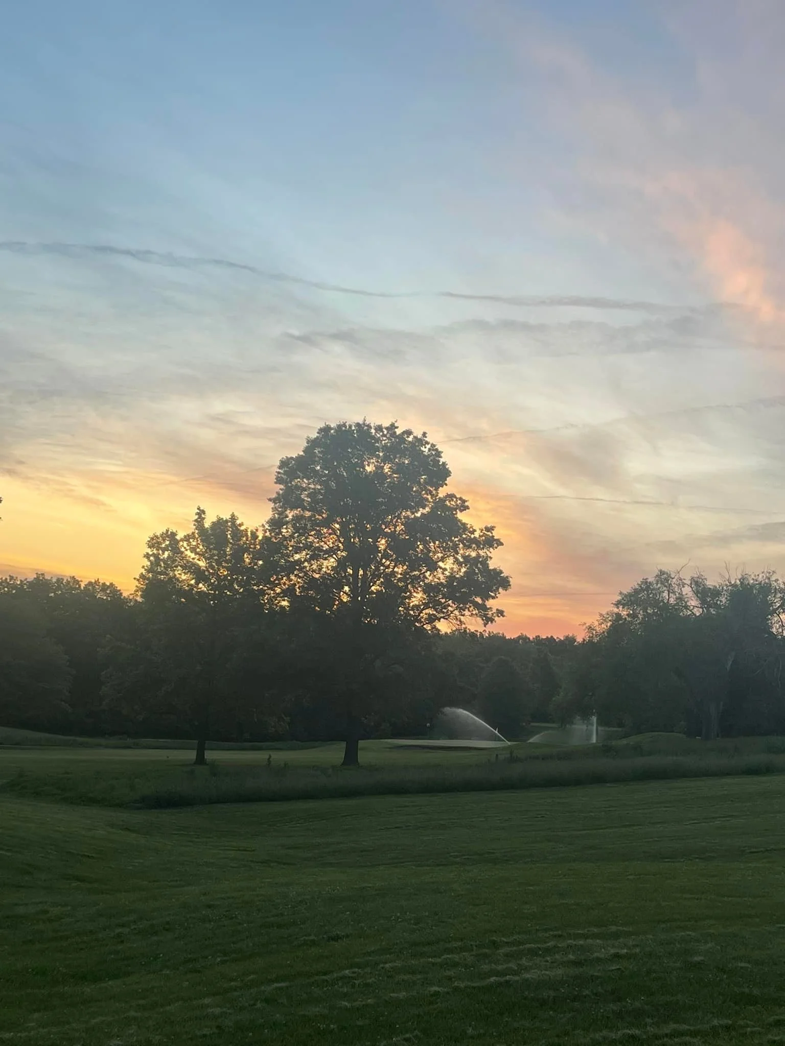 A scenic golf course with green fairways, trees in the background, and a partly cloudy sky.